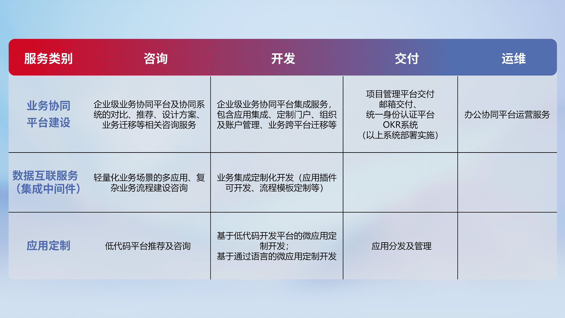 针对钉钉、、企微、、IDaas等平台级产品提供产品的规划、、方案、、、交付、、、定制化开发等服务,,,,实现如统一协同办公、、智能客户服务、、、混合会议管理、、、智能数据查询、、、、等业务场景,,,,实现数字化转型。。。。