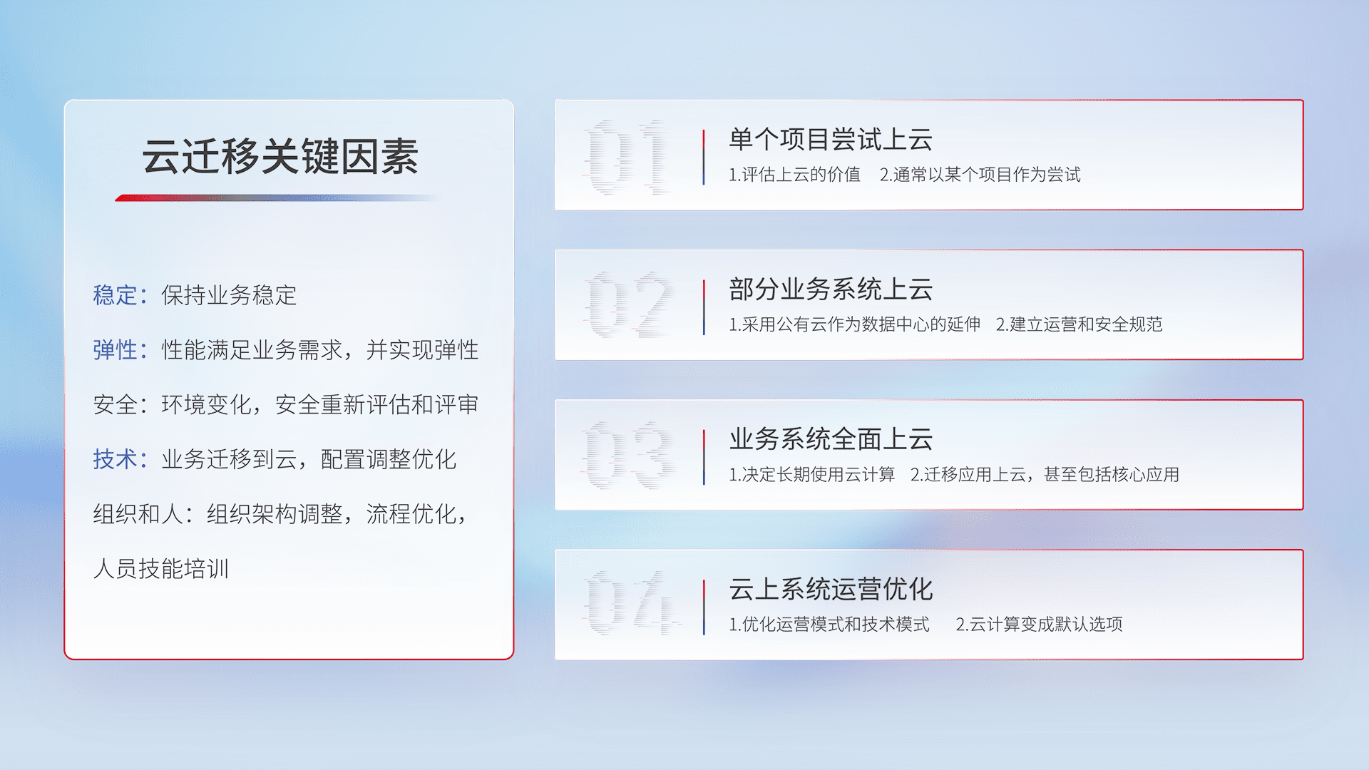 结合实际业务,,从规划设计、、云平台选型、、、、云原生改造、、数据迁移、、集成交付,,,迁移全过程为客户识别最佳上云路径,,,,做好风险识别管理,,设计网络架构、、身份权限、、、安全审计合规、、、、操作审计、、日志审计、、监控告警策略、、、多站点容灾设计等,,,,对云上基础设施进行整体规划,,,,提升IT治理水平,,以满足弹性、、、、高可用、、、高性能的需求。。。。