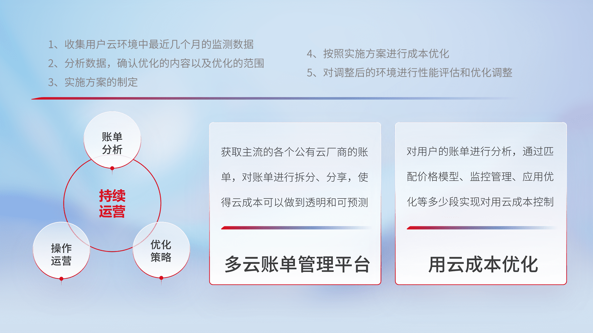 通过多云纳管,,,,以统一的资源数据模型把客户的云资源进行抽象和封装,,,进而实现对多云资源的统一操作,,,保障云资源管理的可靠性、、、稳定性与可用性。。。量身定制化运维内容,,,,配置、、、、开发运维、、、、补丁管理、、、、备份、、、、监控、、、、认证和访问管理、、审计和日常巡检等,,保障在用云过程中的可靠度,,,,稳定度以及高可用率。。